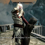 While these various changes in strategy did impact this session’s playthrough flow, the final confrontation with Vyrthur more or less played out the same. The only significant difference, really, was that this time Serana and I confronted him in daylight on the final balcony. And also, I did the fighting while overloaded! Which rather necessitated range fighting, rather than trying to close fast enough for melee.