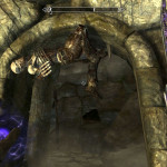 Had a brief amusing instance of Serana and Frea driving a draugr ahead of us, and we finally killed it at the gate that led out into the big open area with the balcony. The draugr fell over right by that gate, and when I pulled the chain to lift it, the draugr got caught on it and rose up with it. Snerk.