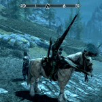 When we got back to Whiterun to report in and get the next stage of the quest, we went ahead and picked up Maurice so we could head out to Eldergleam Sanctuary. We started on the route east past White River Watch, and when we got to the usual spawn point there, what we found was the “horse and dead bandit” random world encounter.