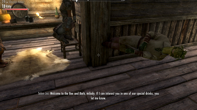 Talking to Maven to get the orders for the Honningbrew Meadery job worked about like it usually does in my usual playthroughs. Including the part where Maven is a cheap bitch and just forks over an enchanted iron weapon for running Goldenglow. Really, the most amusing part of that entire discussion was seeing Talen-Jei hovering horizontally nearby and asking if we wanted drinks.
