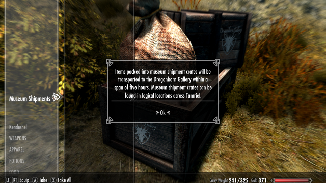 And once I got to Whiterun, I took immediate advantage of the museum delivery crates by the carriage to drop off all the soldier gear I hauled out of Helgen. I figure Kendeshel was all “Well, this isn’t the urns that Auryen asked for, but hell, that gigantic armory he has set up is pretty frigging empty, so now at least he’ll have some samples of armor from the locals.”