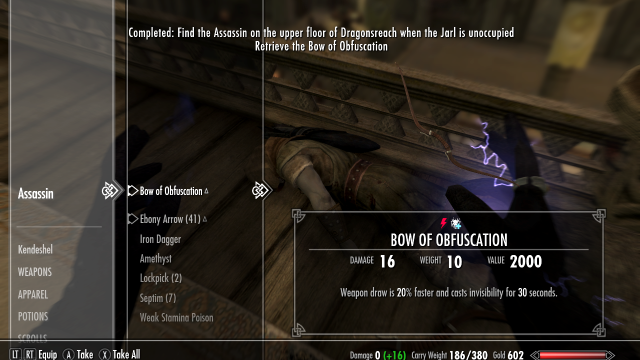 Bow of Shadowser uh Bow of Obfuscation quest queued up - Jenassa, you’ve been a trooper, and earned yourself the right to take it easy, go drink a bunch of mead and tell everybody in the Bannered Mare how you helped the Dragonborn kick a dragon’s ass mmkay?