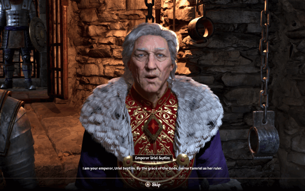 The overall opening sequence of Oblivion is still the same. You’re a prisoner, and surprise, the Emperor and the Blades show up and barge into your cell, because the Blades are trying to hustle Uriel Septim out of the palace to protect him from assassination.