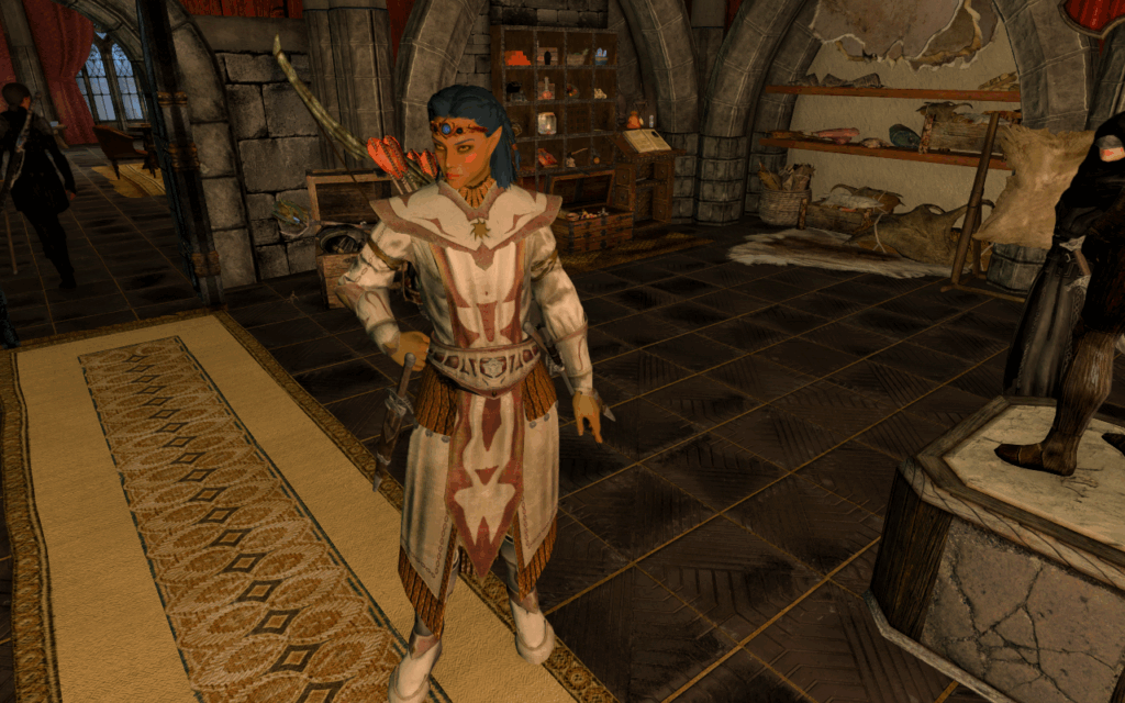 I do actually kinda like the design, and since the character in the pic is in fact an Altmer, it’s very suitable for her. But I feel like you’d kinda have to ignore that this gear is in fact mostly white. All I can think of looking at it is how it’d get dirty AF adventuring around Skyrim. Unless you want to assume that mages have shielding spells to keep dirt off their robes!